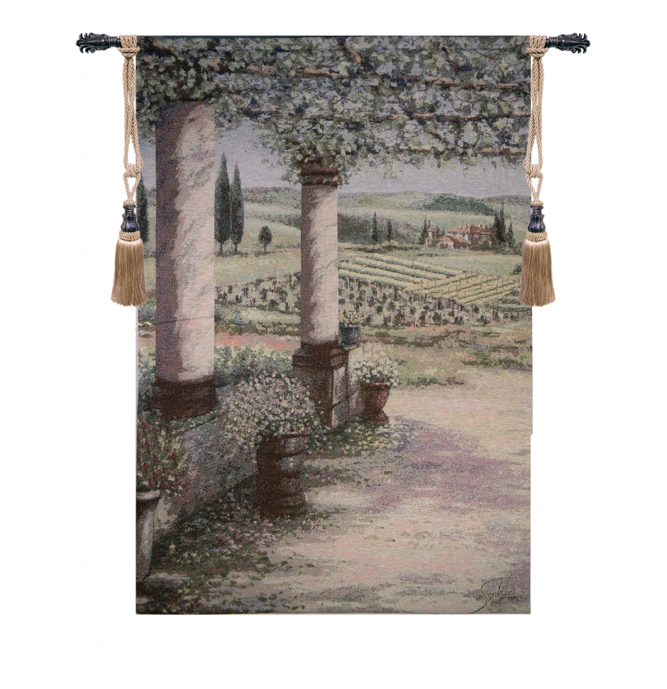 Trebbio West tapestry features the work of artist Sambataro. In this charming tapestry we see a view of the vineyards in Italy as looking out from a concrete terrace.