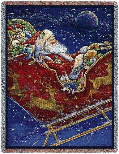 This Christmas tapestry throw is called Midnight Ride. Santa is taking off in this new Donna Race design. An evening setting and Santa is on his way to deliver presents to good boys and girls.