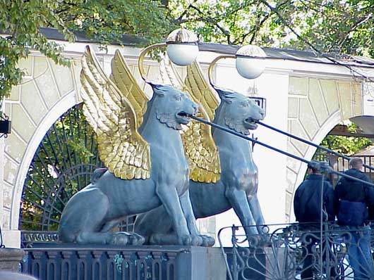 This bridge was designed by the engineer V. Tretter and was built between 1825 and 1826. Pavel Sokolov crafted the fantastic mythological cast-iron animals. Four griffons perch on the bridge's piers, resplendent with their lions' bodies and wings of gold. Lamps protrude form the griffons' heads. Tretter drew the design for the mythical griffins and Sokolov sculpted them from his design. The bodies of the griffins are made of cast-iron and their wings are made of copper.