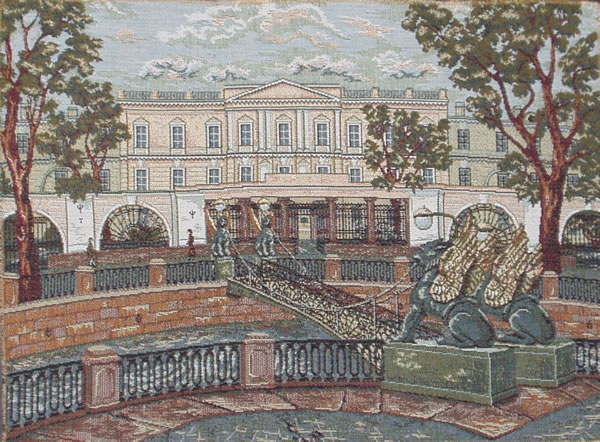 In Arts, Gryphons have also always been depicted as guardians of treasure. The famous bridge, shown on this tapestry, is no exception. This bridge, guarded by four mythological griffins, is located in front of the former State Banknote Bank, as a symbol of its prosperity, and is called the Bank Bridge.