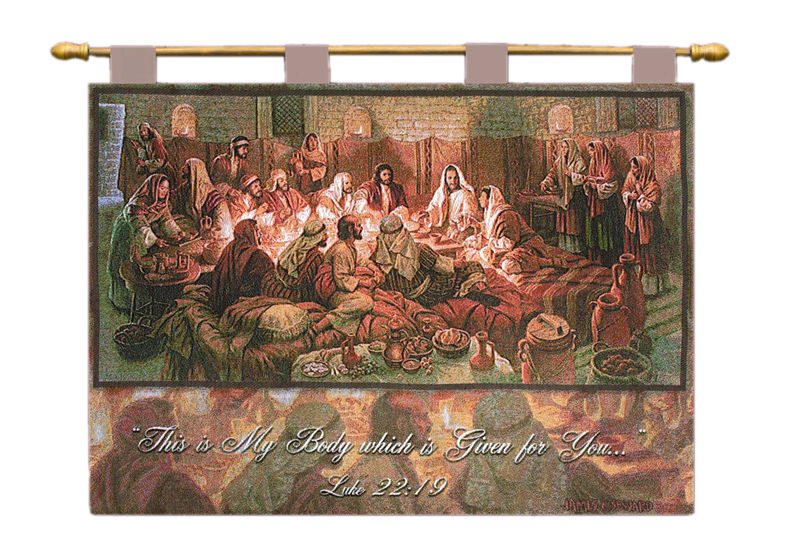 This religious tapestry wall hanging is called This Is My Body. James Seward has created what must have been a common gathering - Jesus listening, sharing, and preaching the word of God. Exquisite detail has been woven into "This is My Body" wallhanging bringing you into the room with them. A wooden rod is included for ease in hanging.