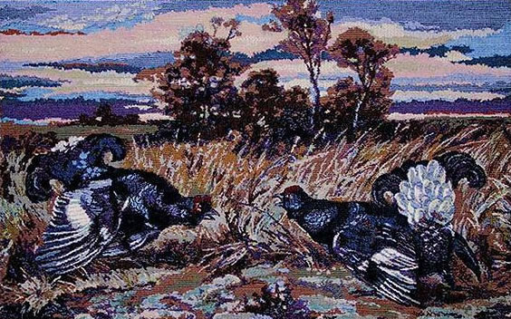 This tapestry shows two great grouses in the field.