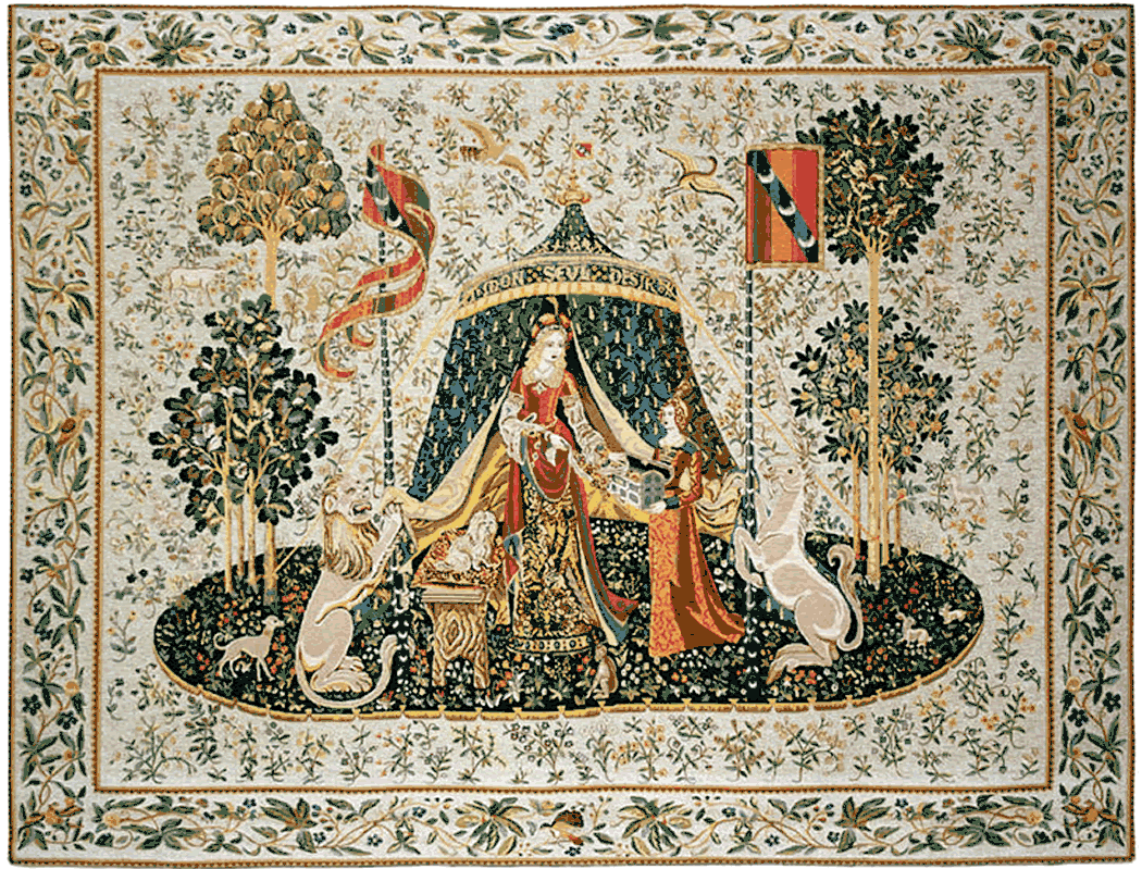 This tapestry wallhanging is called Lady and Unicorn. To My Only Desir in Beige colors.