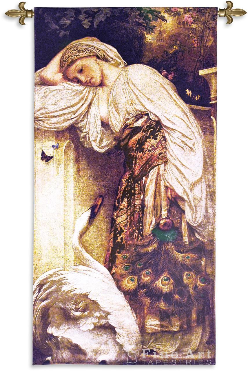 This romantic tapestry wall hanging is called Odalisque. This textile of a languid beauty is one of Lord Leighton's earlier works. And the title of the image - Odalisque - indicates that the subject was not inspired by Classical mythology. Instead, the painting appears to be influenced by the fashionable Nineteenth century obsession with exotic women. Warmly woven in rich hues with vivid contrast of light and dark.